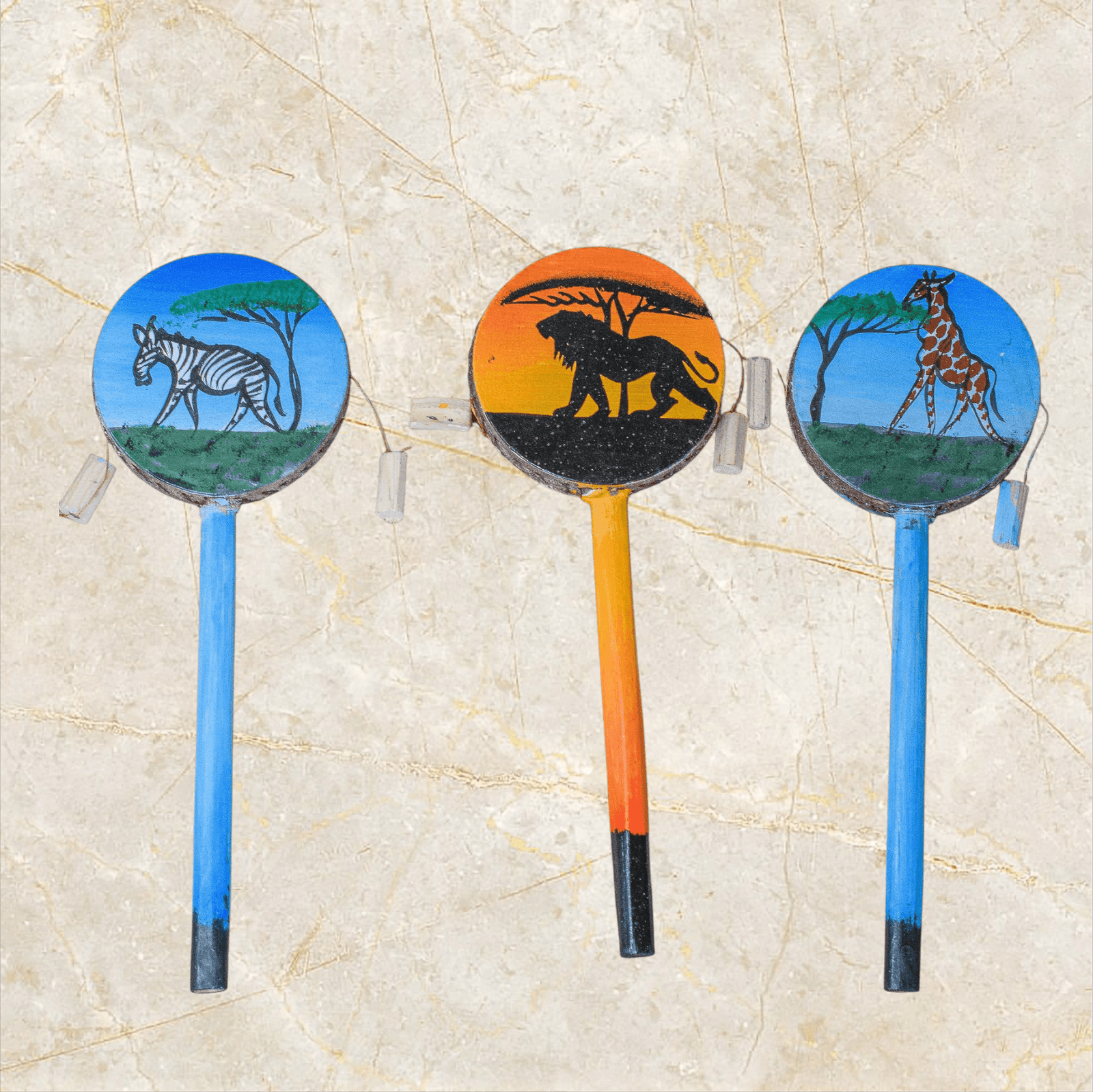 Experience the rhythm and beauty of Africa with this handcrafted African Tic-Tac Drum with Animal Illustrations. Skilled Kenyan artisans and beautifully hand-painted carefully hand-paint each piece to depict African wildlife set against a stunning sunset backdrop.